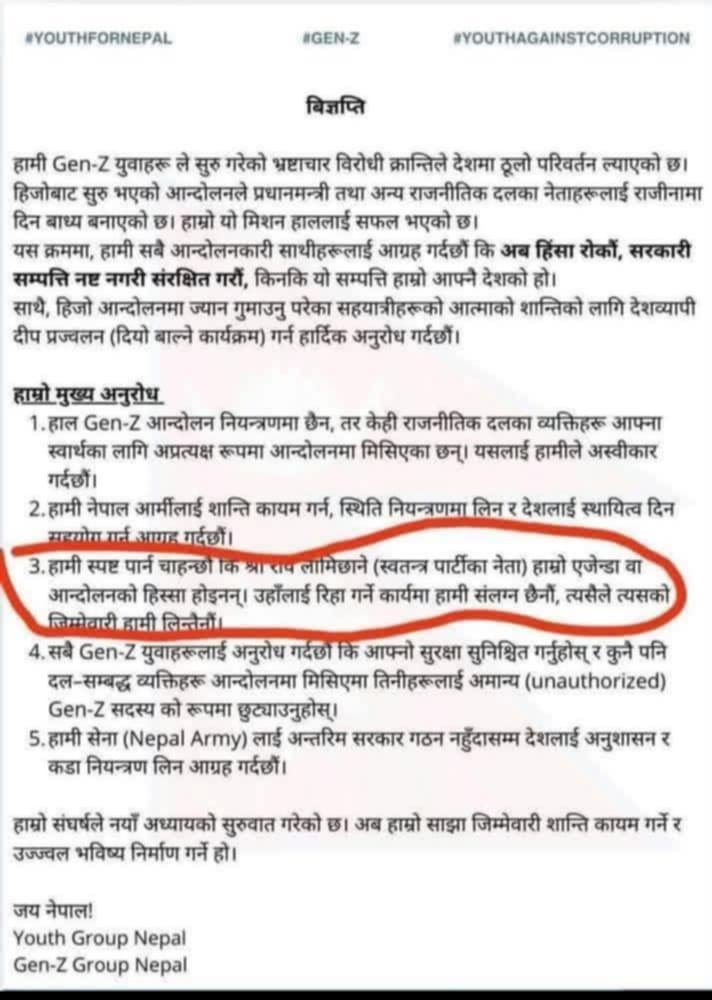 Gen-Z समूहद्वारा रवि लामिछाने रिहाइप्रति स्पष्टिकरण :