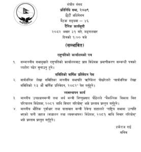 बैठकमा लेखा समितिका सभापति ऋषिकेश पोखरेलले ‘सार्वजनिक लेखा समितिको २३औँ वार्षिक प्रतिवेदन, २०८२’ पेस गर्ने र सभामुख देवराज घिमिरेले राष्ट्रपतिको कार्यालयबाट प्राप्त विधेयक प्रमाणीकरणसम्बन्धी पत्रको व्यहोरा पढेर सुनाउने कार्यसूची छ ।