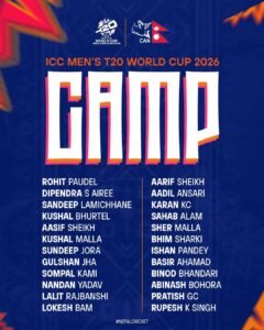 आगामी माघ २५ देखि फागुन २४ गते ( २०२६ फेब्रुअरी ७ देखि मार्च ८) सम्म भारत र श्रीलंकामा आइसिसी टि ट्वान्टी विश्वकप आयोजना हुनेछ । नेपाल समूह ‘सी’ मा इङ्ल्याण्ड, वेस्ट इन्डिज, बंगलादेश, इटालीसँग रहेको छ । नेपालले माघ २५ गते इङ्ल्यान्डसँग विश्व कपको सुरुवात गर्नेछ ।